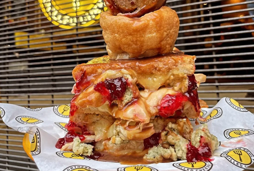 Northern Soul did a call out a while back for ‘cheese testers’ to try its Christmas menu, and we are pleased to say the chosen testers smashed it. By this, we mean the Crimbo Dinner grilled cheese is back on the menu. Crown of turkey, sausage & herb stuffing, cranberry sauce, gravy, in a grilled cheese topped with a Yorkshire pudding and a pig in blanket lollipop. This one has been around for years, and it’s easy to tell why – it’s simply incredible.